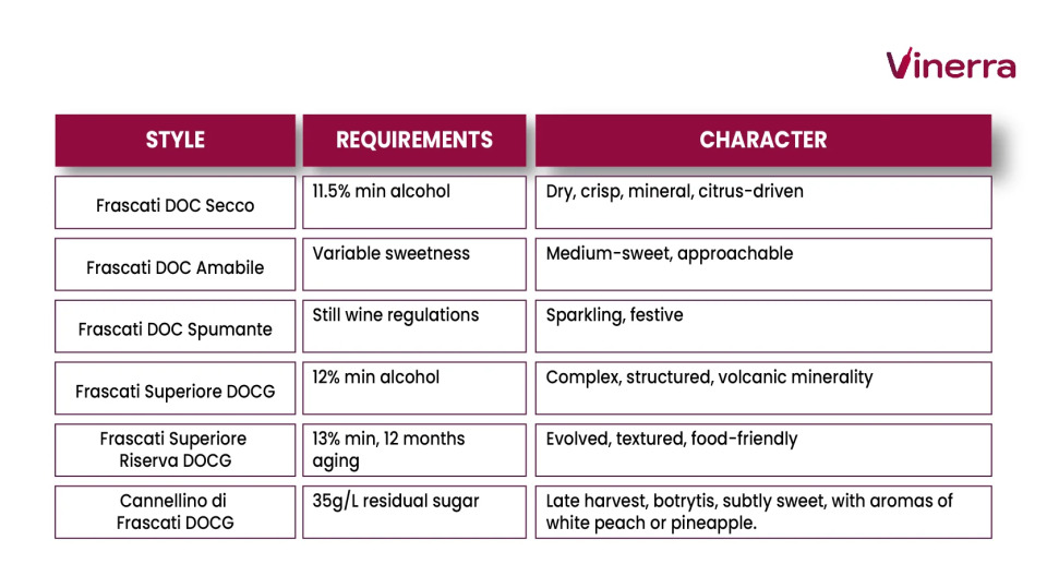 Frascati boasts some of the most distinctive wine styles in Italy. The main styles of the region are the dry Secco, Amabile, Superiore, Superiore Riserva, and the sweet Cannellino di Frascati.